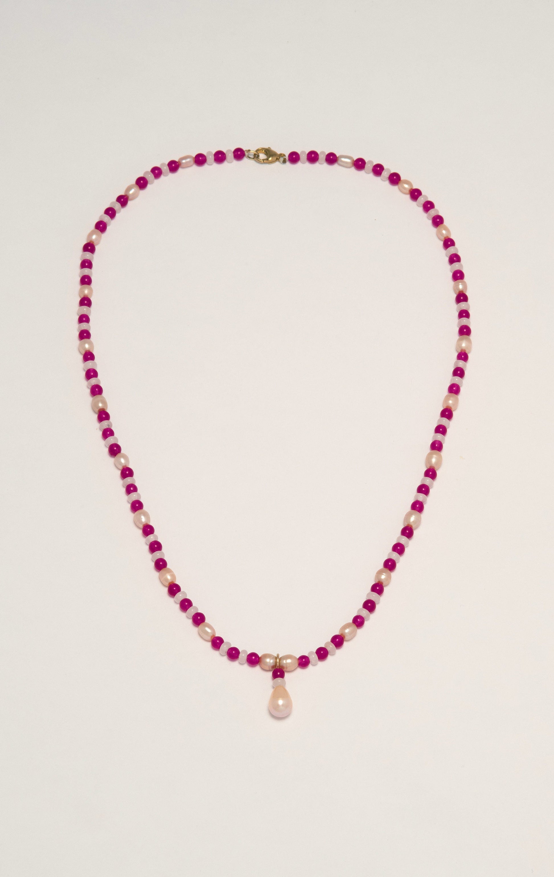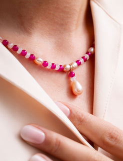 Inspired by Jaipur’s radiant “Pink City,” this necklace holds a cultured freshwater pink pearls, sacred symbols of purity and wisdom in Hindu tradition, with rose and red quartz. This echoes the warmth of Jaipur’s palaces and the serene beauty of the moon, creating earrings that embody grace, balance, and timeless femininity.