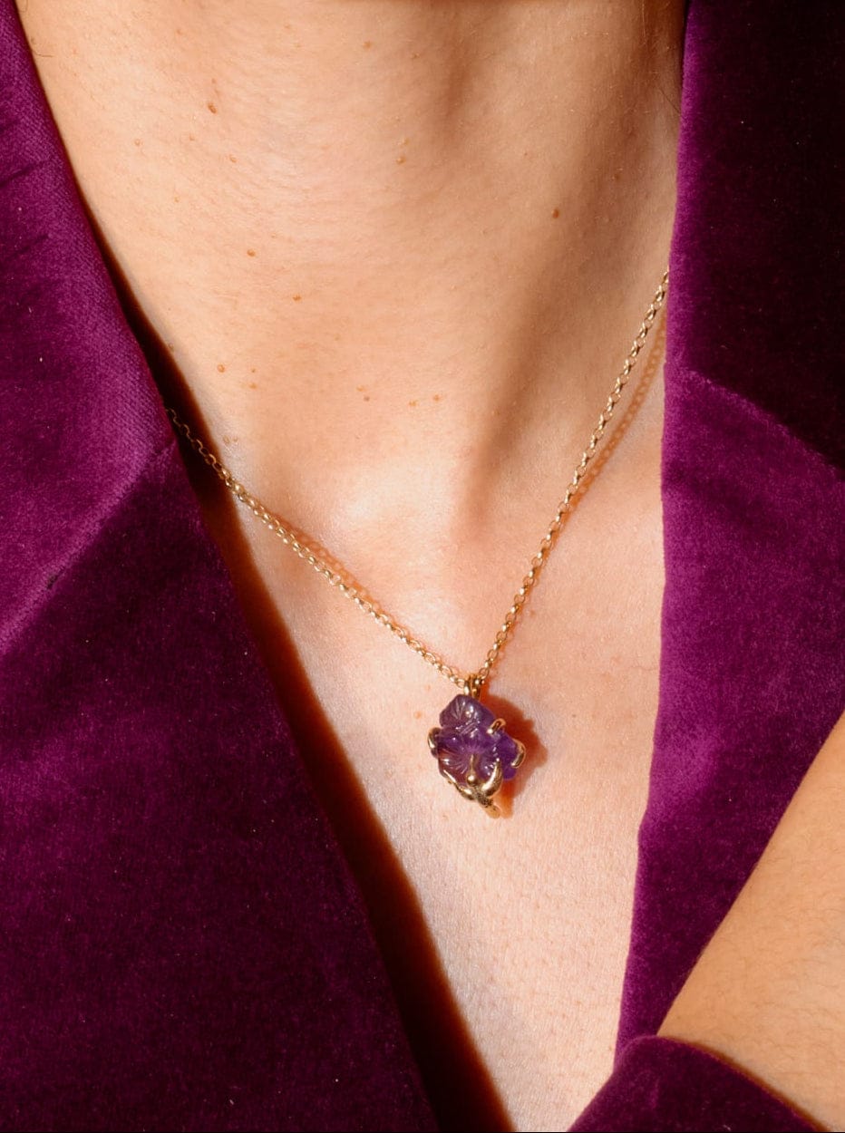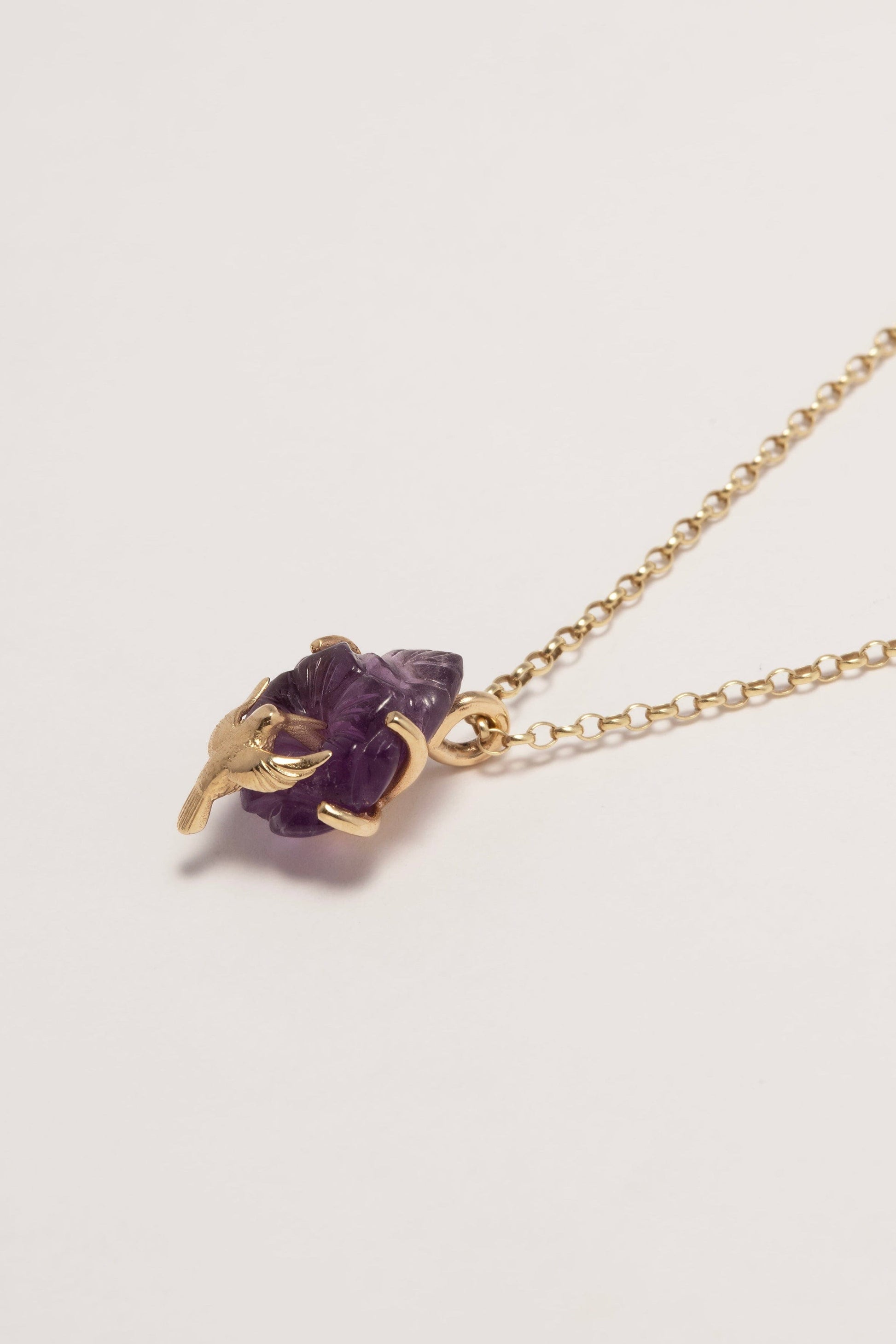 Suspended on a fine chain, this pendant features a delicately sculpted sunbird, poised as if mid-flight, its form light and fluid. At its heart rests a hand-carved amethyst in the shape of a flower, its soft violet tones glowing gently against the warmth of gold, a perfect harmony of material.